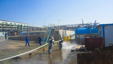 ? ? ? ? 為確保此次演練取得實(shí)效,演練開(kāi)展前,消防隊隊長(cháng)帶領(lǐng)消防隊員和儲運管理部義務(wù)消防隊員對酸罐區各類(lèi)消防設施情況及重點(diǎn)部位進(jìn)行了查看,并結合實(shí)際情況,對滅火作戰預案進(jìn)行完善更新,確保數據準確詳實(shí)。10:30演練正式開(kāi)始,災情假設儲運管理部酸罐區7#硝酸罐閥門(mén)破裂,大量硝酸泄露,一名巡檢人員在巡檢過(guò)程中暈倒,另一人立即報警并組織自救。接到報警后,消防隊迅速攜帶裝備趕赴現場(chǎng),到達現場(chǎng)后,指揮員立即組織開(kāi)展偵查,并下達作戰命令,迅速疏散周邊員工,搜救組在掩護組水槍掩護下進(jìn)行搜救被困人員,另一支戰斗小組利用水幕水帶在下風(fēng)方向對酸霧進(jìn)行不間斷稀釋。11:00演練結束后,消防隊長(cháng)就此次應急救援實(shí)戰演練進(jìn)行了點(diǎn)評,指出了在演練過(guò)程中存在的不足之處,并制定了相應的整改措施,確保順利完成各項滅火救援任務(wù)。安環(huán)部部長(cháng)趙云祥對國慶節前的安全生產(chǎn)工作提出了要求。